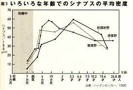 ではいつ頃までにシナプスは 形作られていくのでしょうか? 神経細胞のシナプスは、 誕生後からある年齢まで過剰に作られ その後、急激に減少する と言う特徴を持っています。 このタイミングは重要です。 敏感期の子供の脳にある 過剰なシナプスが 環境からの影響を受けた 脳の機能を大きく変える原因だと 考えられています。 神経学者ピーター・ハッテンロッカーが 人間の前頭連合野における シナプス密度の発展的変化を調べて グラフにしたものがありますが、 前頭連合野は 子供の思考や注意集中力 或は共感や思いやりなどの 高次精神機能に深く関わっている 脳の領域です。 子供の教育を考える上で常に このカーブをイメージしてください。