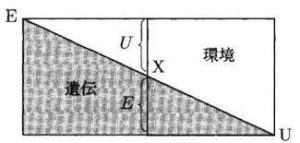 (U=Umfeld(ドイツ語で環境) E=Erbgut(ドイツ語で遺伝)) 例えば図中のXが左に移動すれば するほど遺伝の影響が強くなり、 環境からの影響が小さくなります。 逆に右に移動すれば環境からの 影響が大きくなるというものです。 この説では遺伝と環境は 別々のものであり 各要因を持ち寄っているに すぎないという見方がなされています。
